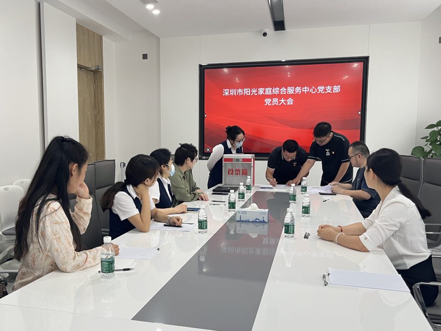 2025年6月27日,中共深圳市阳光家庭综合服务中心支部委员会换届选举大会在庄严隆重的氛围中顺利召开。本次大会严格遵循《中国共产党章程》和《中国共产党基层组织选举工作条例》有关规定,议程安排紧凑有序,过程公开透明、公正规范,圆满完成了各项选举工作,成功选举产生了新一届的支部委员会。
