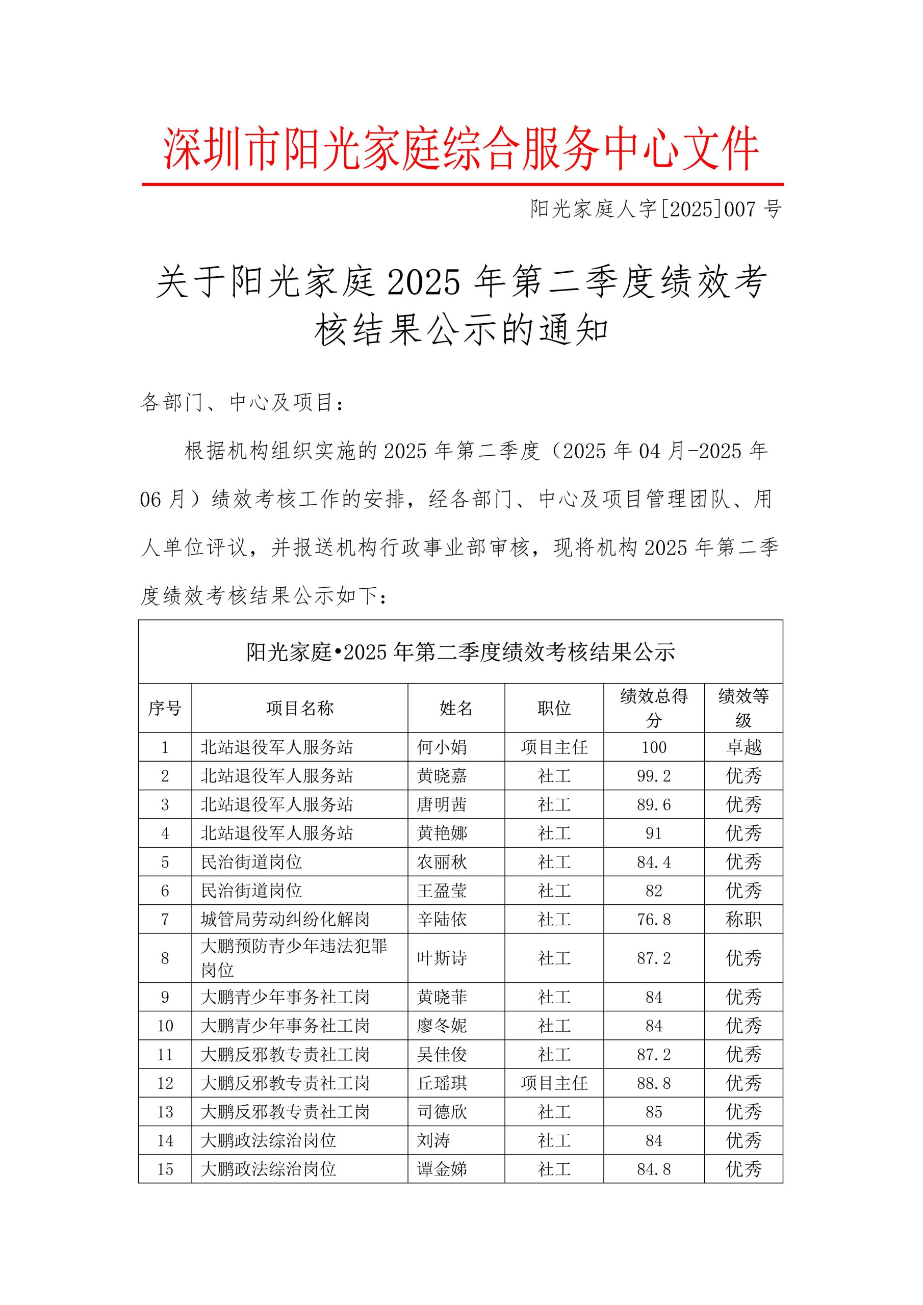 分类: 通知公告2025 年 7 月 25 日Related Posts阳光家庭服字[2025]004号-关于2025年上半年服务总结资料收集通知2025 年 7 月 4 日阳光家庭服字[2025]003号-关于2025年第二期社会工作者上岗基础知识培训及考试通知2025 年 7 月 2 日阳光家庭行字[2025]005号 关于2025年端午节放假安排的通知2025 年 5 月 27 日阳光家庭人字[2025]004号-阳光家庭2024年度评优表彰结果公示2025 年 5 月 15 日阳光家庭服字[2025]002号-关于开展深圳市注册社会工作者2025年度续期注册的通知2025 年 5 月 7 日阳光家庭人字[2025] 005号 关于阳光家庭2025年第一季度绩效考核结果公示的通知2025 年 4 月 25 日