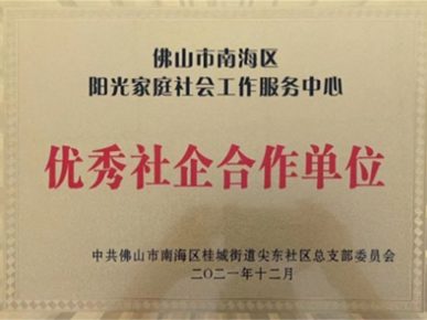 | 2021年12月 | 《中共佛山市南海区桂城街道尖东社区总支部委员会——优秀社企合作伙伴》 | 中共佛山市南海区桂城街道尖东社区总支部委员会 | 镇街级 |