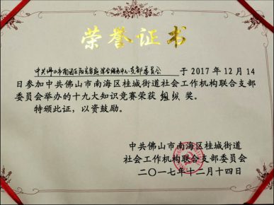 | 2017年12月 | 十九大知识竞赛活动组织奖(叠北小候鸟) | 中共佛山市南海区桂城街道社会工作机构联合支部委员会 | 镇街级 |