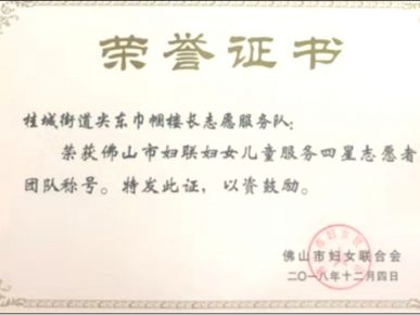 | 2018年12月 | 尖东巾帼楼长志愿服务队获得佛山市妇联妇女儿童服务四星志愿者团队称号 | 佛山市妇女联合会 | 市级 |