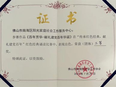 | 2021年7月 | 《佛山市南海区社会工作协会——“传承红色经典,献礼建党百年”红色经典朗诵比赛三等奖》 | 佛山市南海区社会工作协会 | 区级 |