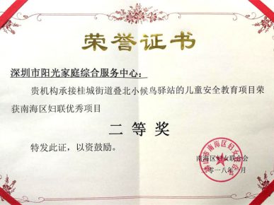 | 2018年1月 | 儿童安全教育项目获得南海区妇联优秀项目二等奖(叠北小候鸟) | 佛山市南海区妇女联合会 | 区级 |