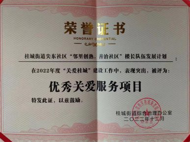 | 2022年12月 | 《2022年度桂城街道优秀关爱服务项目》桂城街道尖东社区“邻里创熟,善治社区”楼长队伍发展计划 | 佛山市南海区桂城街道综合治理办公室 | 镇街级 |