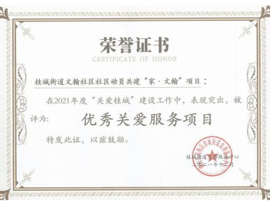 | 2021年12月 | 《2021年度桂城街道优秀关爱服务项目》桂城街道文翰社区社区动员共建“家•文翰”项目 | 桂城街道党群服务中心 | 镇街级 |