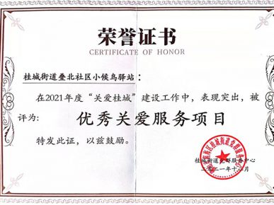 | 2022年12月 | 《2022年度桂城街道优秀关爱服务项目》桂城街道叠北社区小候鸟驿站 | 佛山市南海区桂城街道综合治理办公室 | 镇街级 |