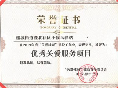 | 2021年12月 | 《2021年度桂城街道优秀关爱服务项目》桂城街道叠北社区小候鸟驿站 | 桂城街道党群服务中心 | 镇街级 |