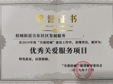 | 2019年11月 | 2019年“关爱 基金”优秀项目(尖东社区项目) | “关爱桂城”建设督导委员会 | 镇街级 |