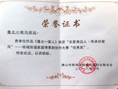 | 2018年3月 | 《叠北一家人》获得桂城街道家庭情景剧创作大赛优秀奖(叠北小候鸟) | 佛山市南海区妇女联合会 | 区级 |