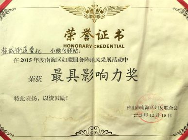 | 2015年12月 | 2015年度南海区妇联服务阵地风采展活动中活动最具影响力奖(叠北小候鸟) | 佛山市南海区妇女联合会 | 区级 |