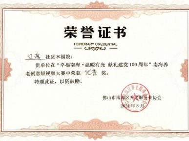 | 2021年8月 | 《“幸福南海,温暖有光,献礼党建100周年”南海养老创意短视频大赛中荣获优秀奖》桂城街道江滨社区幸福院社工服务 | 佛山市南海区养老服务业协会 | 区级 |