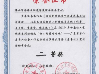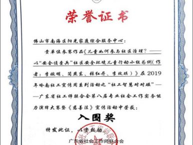 | 2019年3月 | 《儿童如何参与社区治理?-以“安全侦察兵”社区安全环境儿童行动小组为例》在2019年岭南社工宣传周系列活动之“社工智慧对对碰”——广东省第八届专业社会工作实务能力演绎大赛暨《慈善法》宣传活动获得入围奖 | 广东省社会工作师联合会、佛山市南海区慈善会 | 省级 |