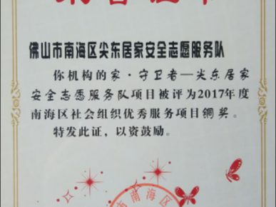 | 2017年12月 | 尖东居家安全志愿服务队被评为2017年度南海区社会组织优秀服务项目铜奖 | 南海区民政局 | 区级 |