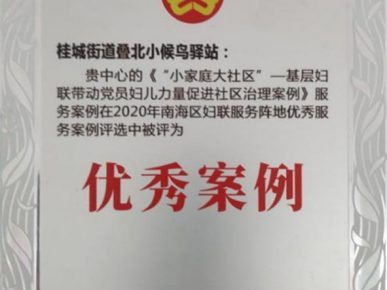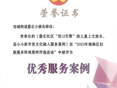 | 2020年 | 2020年南海区妇联服务阵地优秀案例(叠北小候鸟) | 南海区妇联 | 区级 |