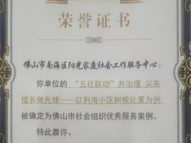 | 2023年5月 | “五社联动”共治理尖东楼长做先锋——以利海小区树根处置为例被确定为佛山市社会组织优秀服务案例 | 佛山市社会组织管理局 | 市级 |