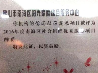 | 2019年1月 | 南海区2014-2019年“本土督导培养项目总结之督导风采展示会”优秀组织奖; | 佛山市南海区民政局、广东省社会工作联合会、南海社协 | 省级 |