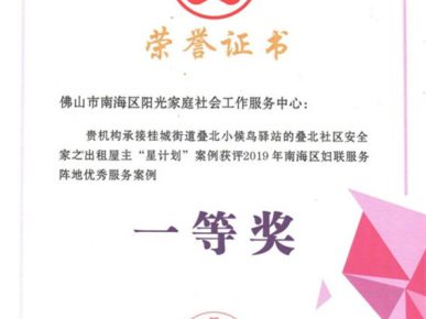 | 2019年12月 | 叠北社区安全家纸出租屋主“星计划”案例获评2019年南海区妇联服务阵地优秀服务案例一等奖(叠北小候鸟) | 南海区妇联 | 区级 |