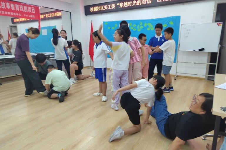 2024年8月19日,桂园社区党委、关工委、妇联、党群服务中心联合启动“穿越时光的对话”红色故事教育戏剧项目,该项目以中国共产党领导下百年奋斗历程中的五个红色故事为轴,采用戏剧形式搭建历史情景,让青少年在角色扮演中沉浸式体验革命先烈的坚定信念与伟大精神。
